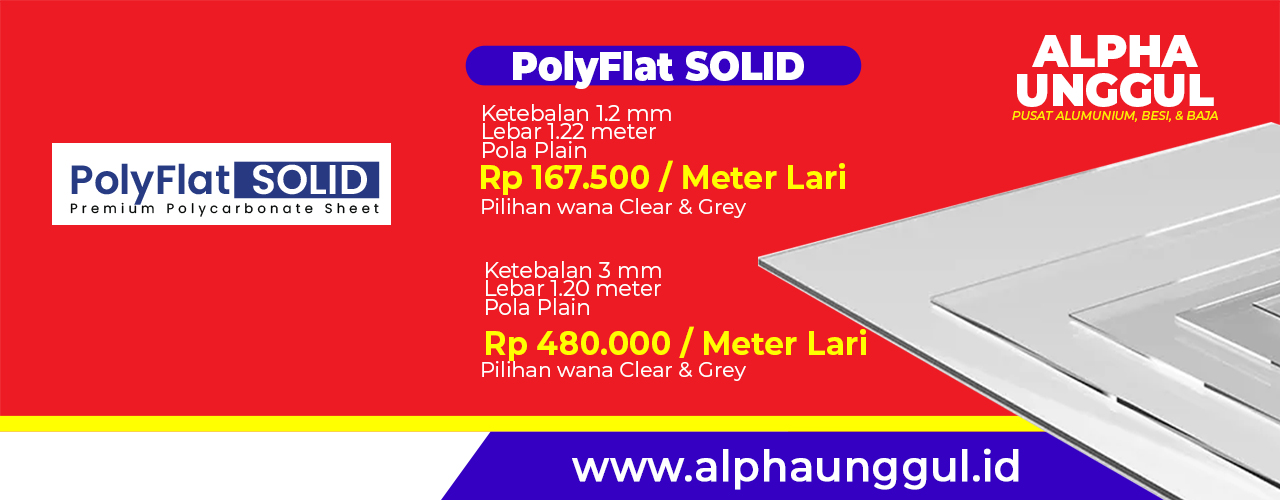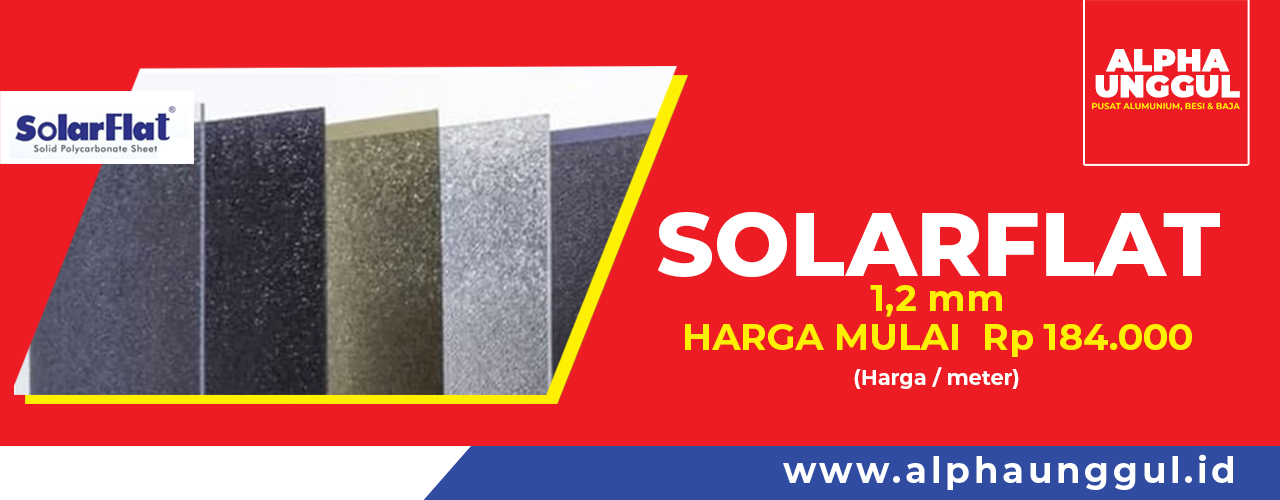 lembaran polycarbonate solid yang tidak bergelombang dengan tingkat kejernihan paling tinggi dan tahan terhadap benturan paling keras sekalipun. SolarFlat diproduksi dengan menggunakan material terbaik dan dengan teknologi terkini dari Eropa yang sudah berpengalaman lebih dari 30 tahun di industri ini. Memiliki tingkat tembus pandang (transparansi) seperti kaca, namun sangat kuat